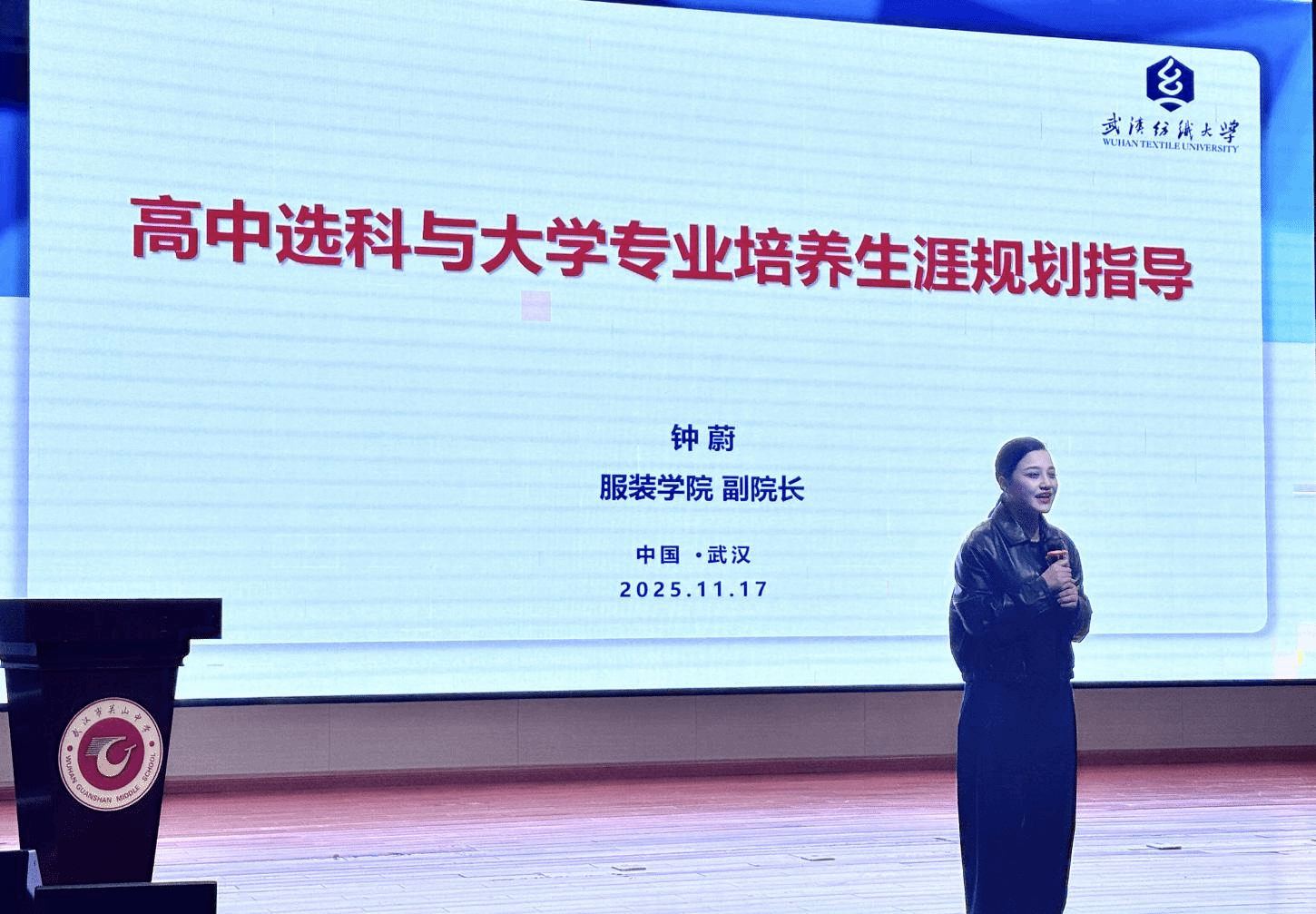 为加强服装学院与优质生源中学的有效衔接,助力高中生科学规划学业与职业发展,11月17日下午,武汉纺织大学服装学院副院长钟蔚教授一行应邀前往武汉市关山中学,开展题为《高中选科与大学专业培养生涯规划指导》的专题讲座。关山中学校长徐建平、副校长刘国胜、年级主任、美术学科带头人及全体高一年级学生共800余人参加活动。